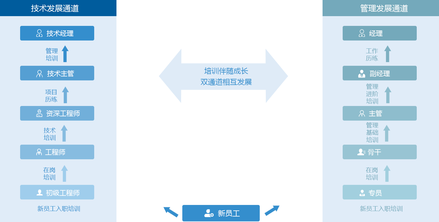 公司為員工提供了技術(shù)和管理雙通道發(fā)展,使得不同員工在公司都能找到適合自己發(fā)展的通道。在發(fā)展的過程中通過培訓(xùn)、工作歷練、項目歷練讓員工穩(wěn)步發(fā)展。